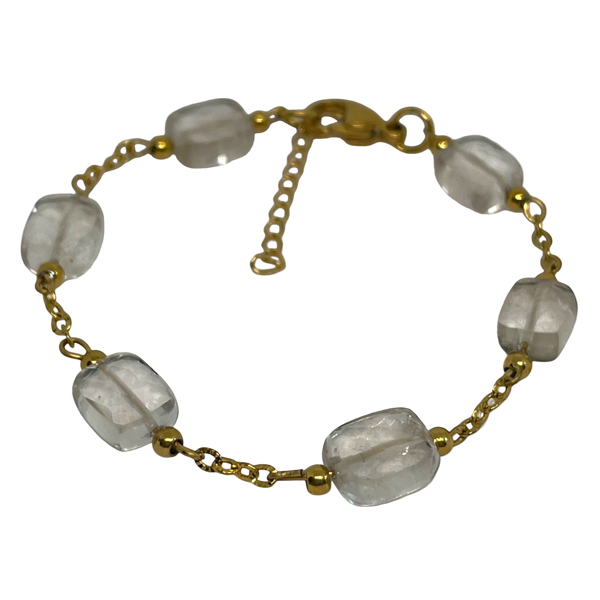 Simplicity meets elegance in this Clear Quartz bracelet. Featuring translucent rectangular beads that symbolize clarity and healing, this piece is designed to uplift your everyday look. The gold-plated chain adds a refined glow, making it perfect for layering or standing on its own.