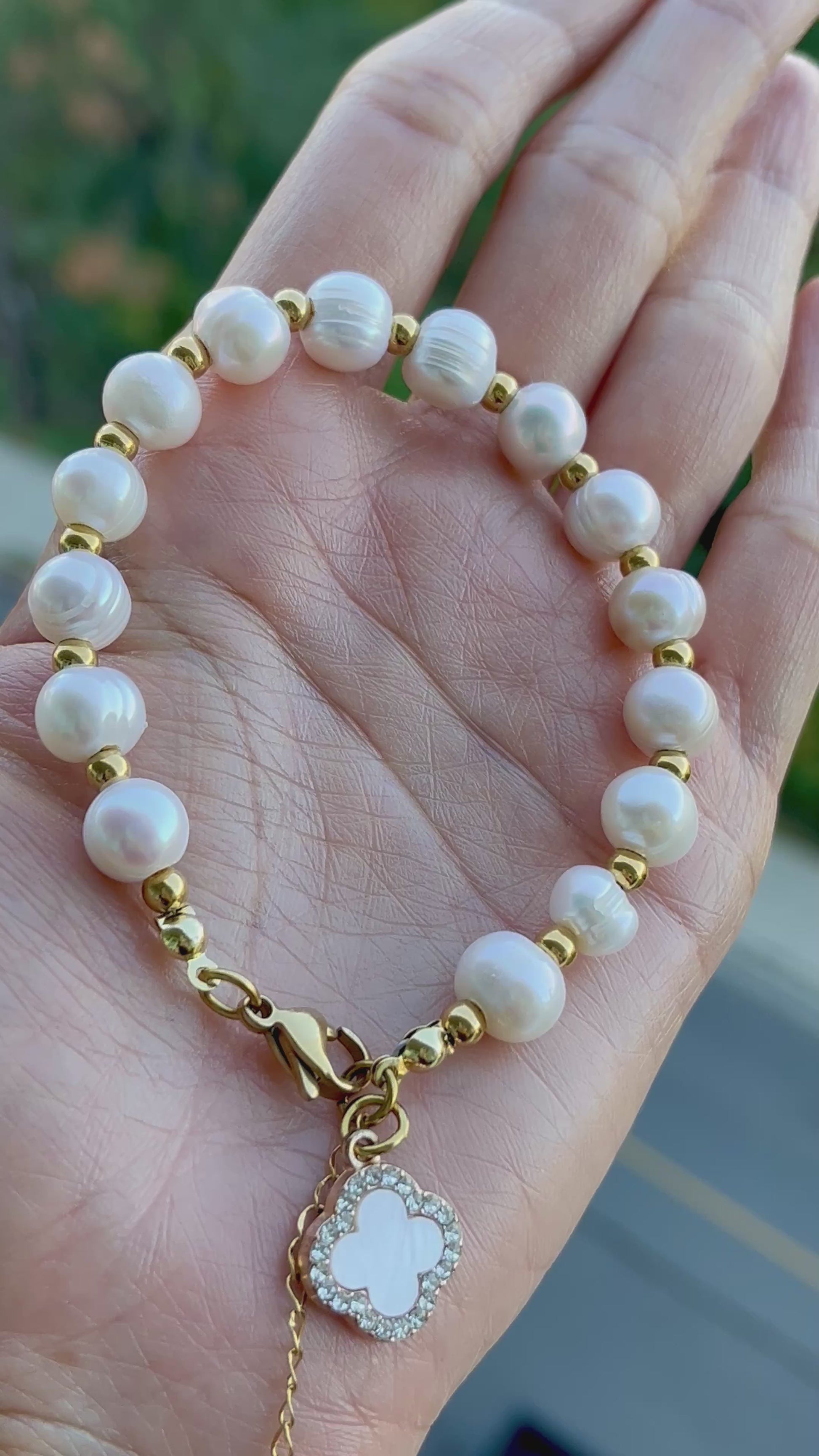 Elegant and versatile, this bracelet features luminous freshwater pearls strung with gold-plated beads, finished with a delicate mother-of-pearl clover charm framed in sparkling crystals. A charming blend of tradition and trend, perfect for everyday wear or special occasions.