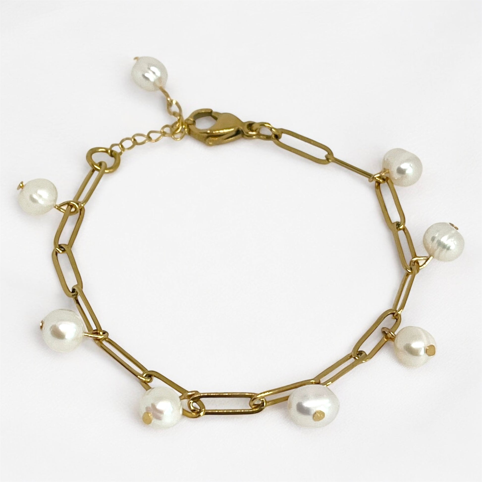 Elegant and timeless, this bracelet features lustrous freshwater pearl charms delicately suspended from a trendy paper clip-style chain. A perfect fusion of modern chic and classic beauty.