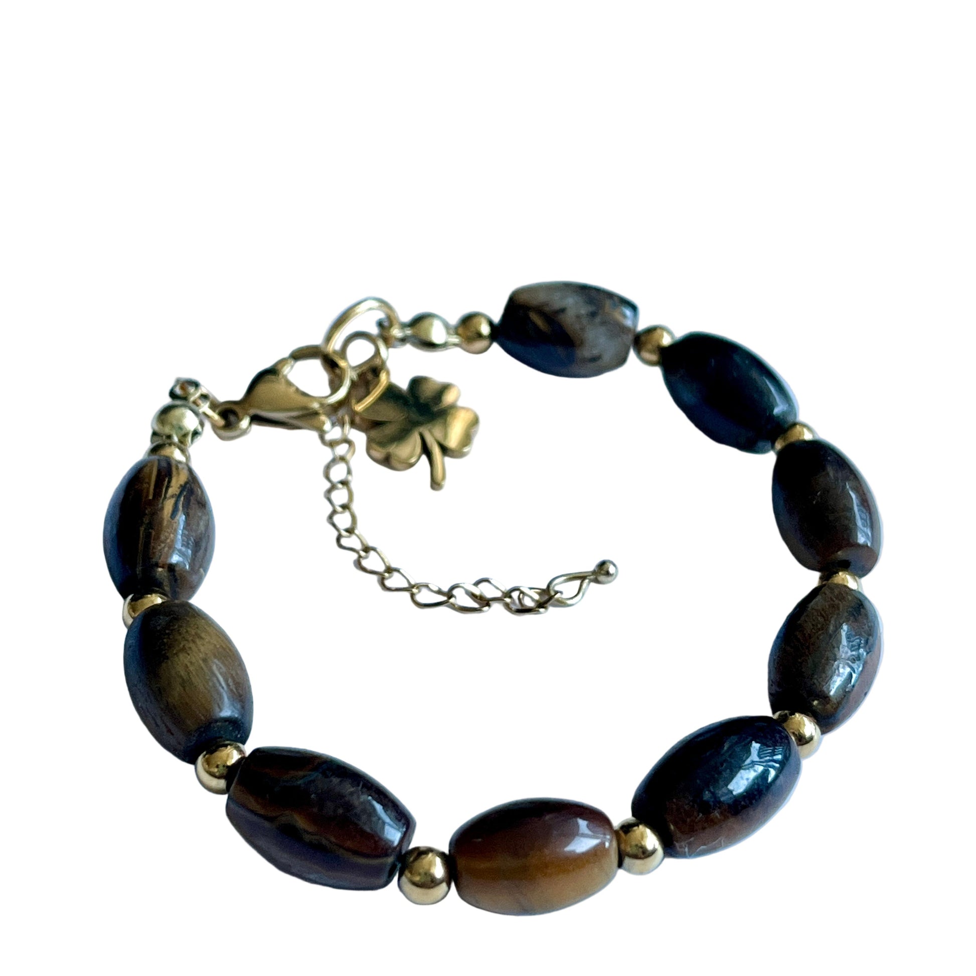 This bold bracelet features rich, oval-cut tiger eye gemstones known for their protective and grounding properties. Accented with gold-plated beads and a four-leaf clover charm for added luck, it’s a timeless piece for everyday confidence and strength.
